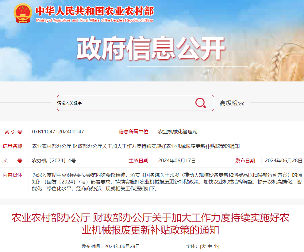 農(nóng)業(yè)農(nóng)村部等部門關(guān)于加大工作力度持續(xù)實(shí)施好農(nóng)業(yè)機(jī)械報(bào)廢更新補(bǔ)貼政策的通知(最高可領(lǐng)3萬(wàn)元)