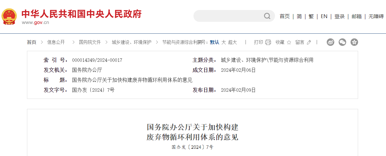 *********辦公廳關(guān)于加快構(gòu)建廢棄物循環(huán)利用體系的意見