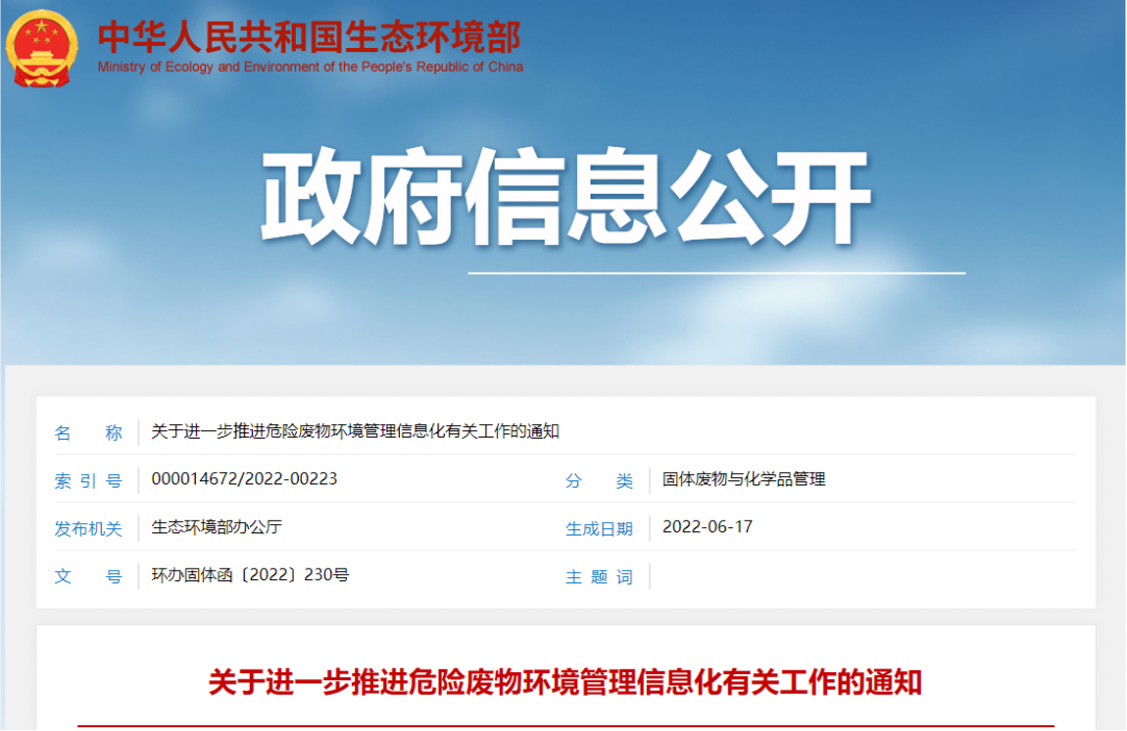 生態(tài)環(huán)境部關(guān)于進一步推進危險廢物環(huán)境管理信息化有關(guān)工作的通知各省、自治區(qū)、直轄市生態(tài)環(huán)境廳(局),新疆生產(chǎn)建設(shè)兵團生態(tài)環(huán)境局:為貫徹落實《中華人民共和國固體廢物...
