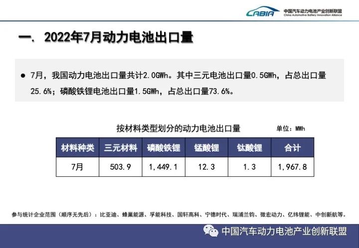 出口量方面:7月,我國動力電池出口量共計(jì)2.0GWh。其中三元電池出口量0.5GWh,占總出口量 25.6%;磷酸鐵鋰電池出口量1.5GWh,占總出口量73.6%。