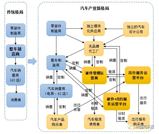 隨著汽車消費(fèi)側(cè)出現(xiàn)消費(fèi)者從買車到租車,從購買汽車產(chǎn)品轉(zhuǎn)向購買出行服務(wù),傳統(tǒng)整車企業(yè)通過產(chǎn)品品牌對(duì)消費(fèi)者的影響力減弱;隨著汽車電動(dòng)化、數(shù)字化、網(wǎng)絡(luò)化和平臺(tái)化的發(fā)展趨向,傳統(tǒng)整車企業(yè)通過垂直分工體系對(duì)供應(yīng)鏈的控制力逐步減弱;隨著具有典型互聯(lián)網(wǎng)模式、對(duì)消費(fèi)者偏好和需求有充分了解的平臺(tái)公司崛起,以傳統(tǒng)整車企業(yè)為中心的產(chǎn)業(yè)流程正在改變,產(chǎn)業(yè)重心正在從汽車制造向出行服務(wù)轉(zhuǎn)移。汽車產(chǎn)業(yè)經(jīng)歷了上百年的發(fā)展,以傳統(tǒng)整車企業(yè)為中心、大規(guī)模生產(chǎn)和大規(guī)模銷售模式為主導(dǎo)的傳統(tǒng)汽車產(chǎn)業(yè)格局正在走向以滿足個(gè)性化消費(fèi)和出行服務(wù)為中心的新產(chǎn)業(yè)格局。下圖為汽車傳統(tǒng)產(chǎn)業(yè)格局和新產(chǎn)業(yè)格局的對(duì)比。